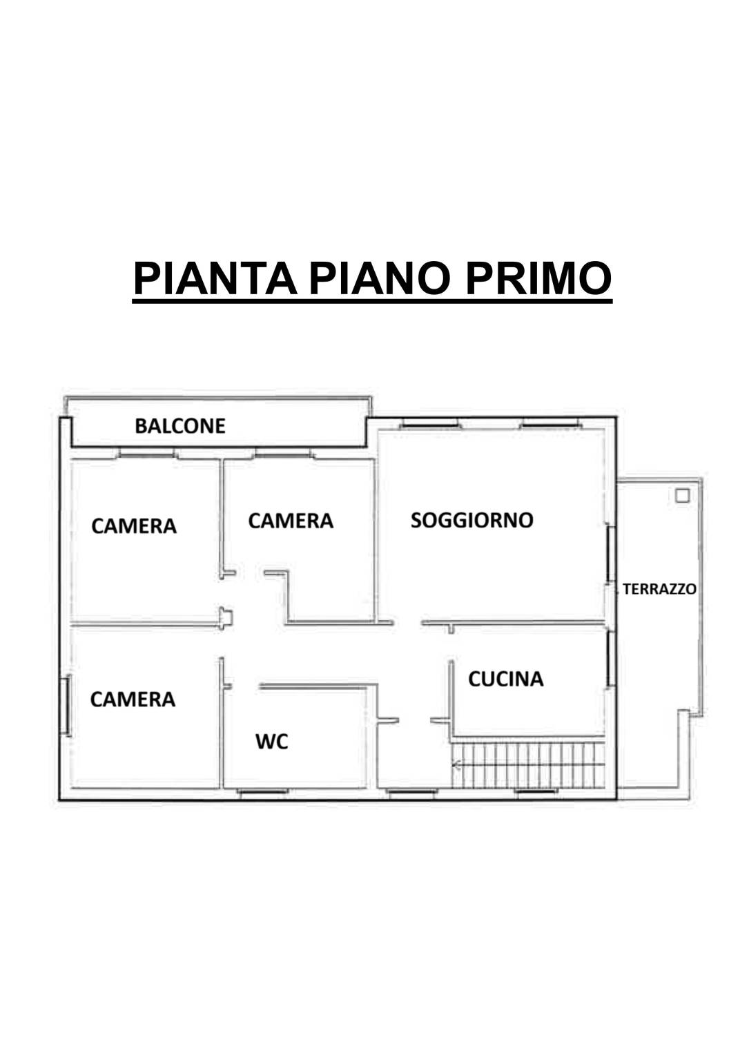 • Piano primo: con accesso indipendente, composto da cucina abitabile con terrazzo molto ampio, luminoso e spazioso soggiorno, bagno e tre camere da letto, di cui due con balcone. Tutti gli ambienti sono ampi, ben distribuiti e particolarmente luminosi.